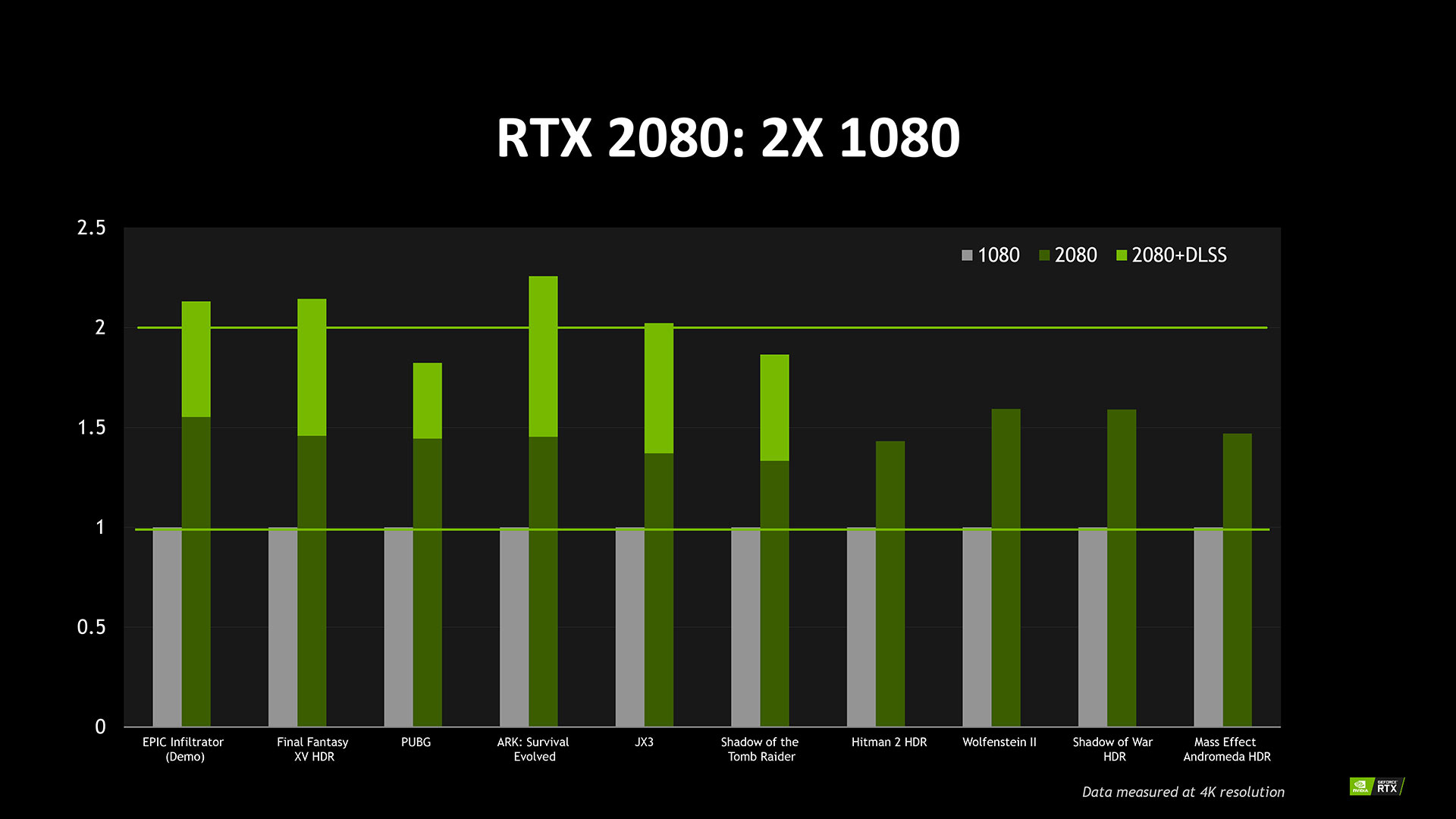 例えば、EPIC Infiltrator、Final Fantasy XV HDR、PUBG、ARK:Survival Evolved、JX3、Shadow of the Tomb RaiderはDLSS対応で約2倍、Hitman2 HDR、Wolfenstein II、Shadow of War HDR、Mass Effect Andromeda HDRは約1.5倍の結果が確認されています。